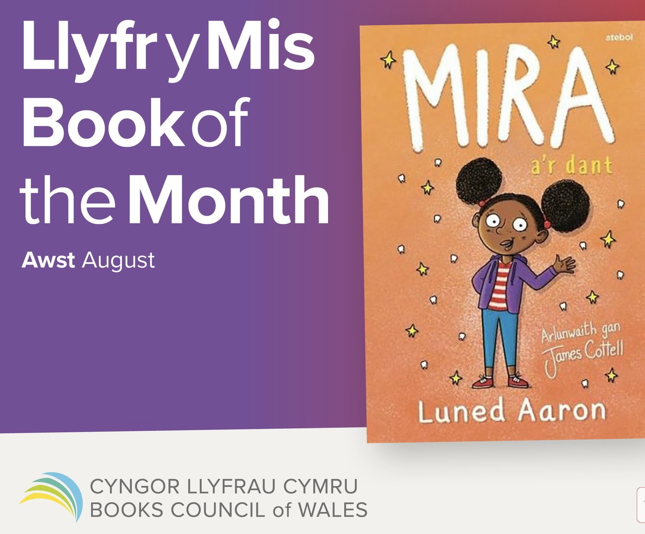 Mira a’r Dant was chosen by the Book Council of Wales to be the ‘Book of the Month’ when the novel was launched in August 2022. The book is beautifully illustrated by the talented James Cottell. Currently working on the sequel in the ‘Mira’ series, Mira a’r Trip Ysgol which will be launched in the Spring of 2023.